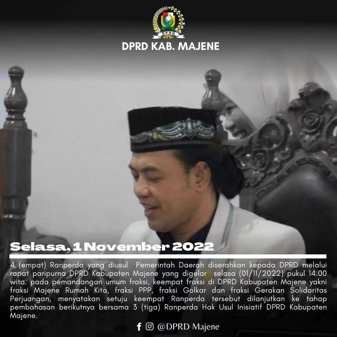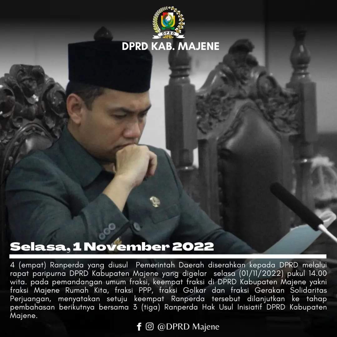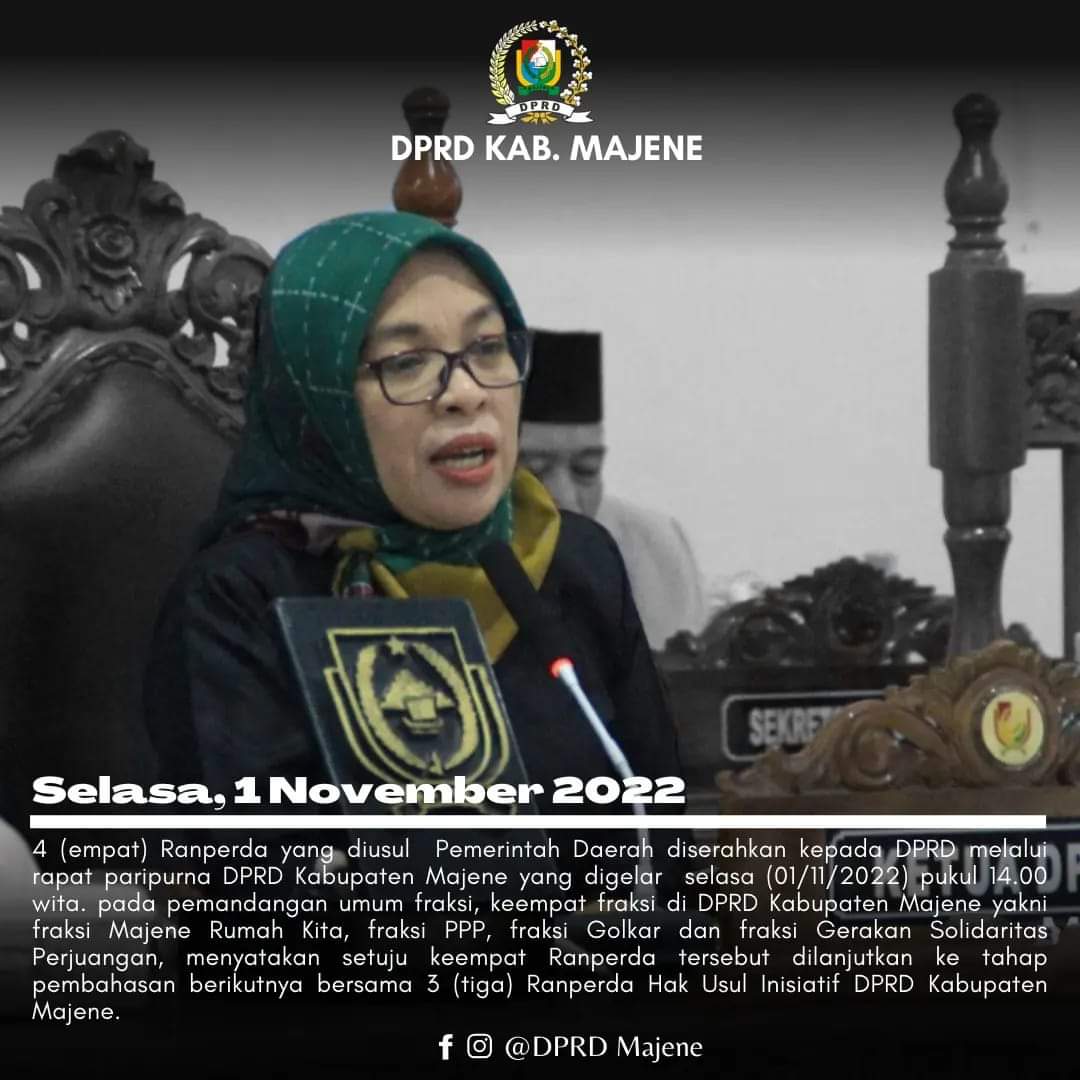 Empat Ranperda yang diusul Pemerintah Daerah (Pemda) diserahkan Wakil Bupati Arismunandar kepada Ketua DPRD Salmawati Djamado melalui rapat Paripurna DPRD Kabupaten Majene yang digelar Selasa (01/11/2022) pukul 14.00 Wita. Pada pemandangan umum fraksi keempat fraksi di DPRD Majene yakni Fraksi Majene Rumah Kita, Fraksi PPP, Fraksi Golkar dan Fraksi Gerakan Solidaritas Perjuangan (GSP) menyatakan setuju keempat Ranperda tersebut dilanjutkan ke tahap pembahasan berikutnya bersama tiga Ranperda Hak Usul Inisiatif DPRD Kabupaten Majene.