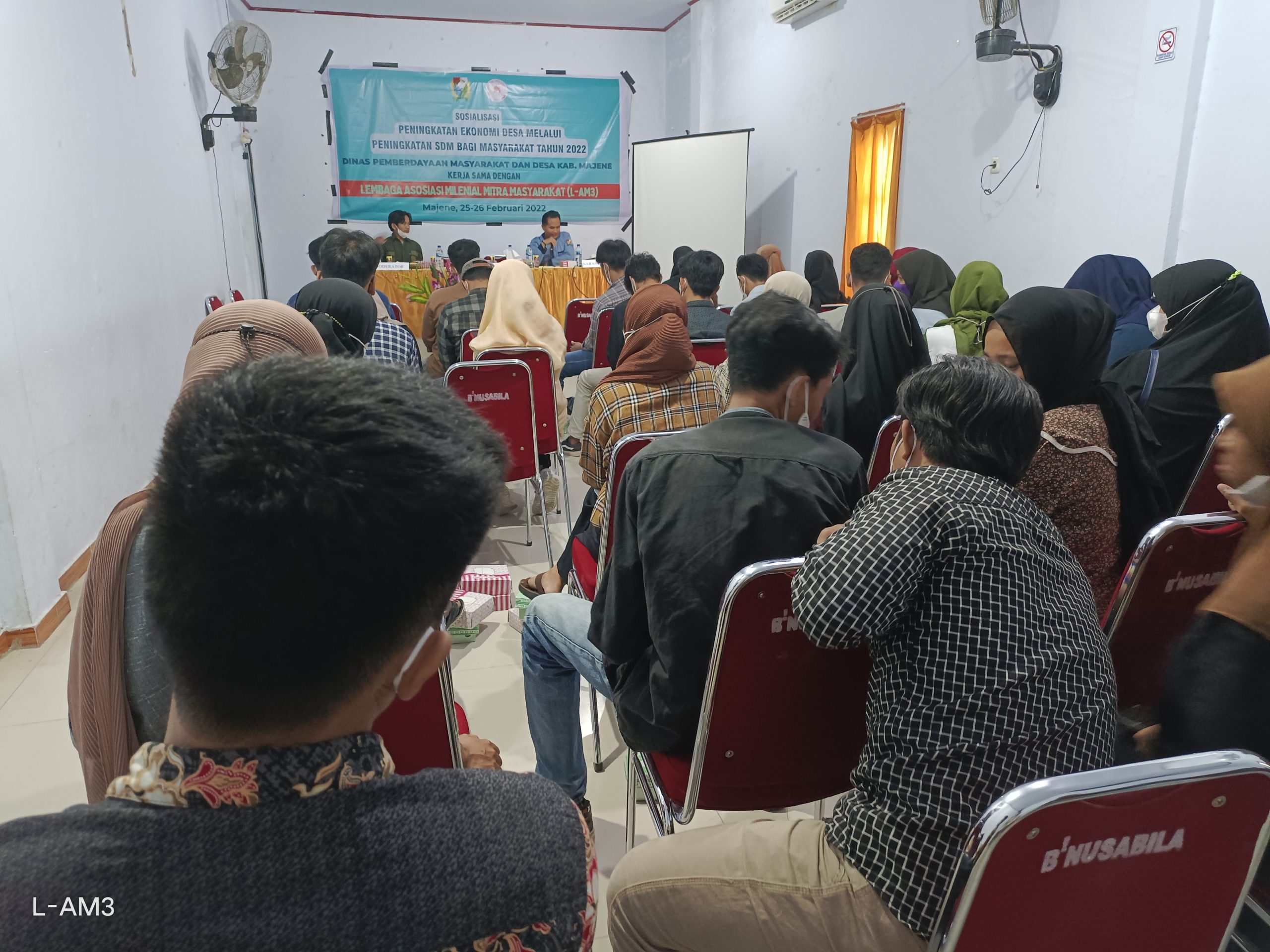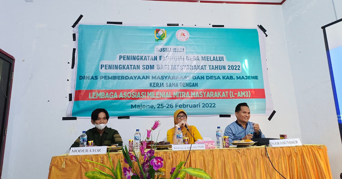 Majene,Rakyatta.com- Bekerjasama dengan Lembaga Asosiasi Milenial Mitra Masyarakat (L-AM3), Dinas Pemberdayaan Masyarakat dan Desa Kabupaten Majene gelar Sosialisai Peningkatan Ekonomi Desa Melalui Sumber Daya Masayarakat(SDM).