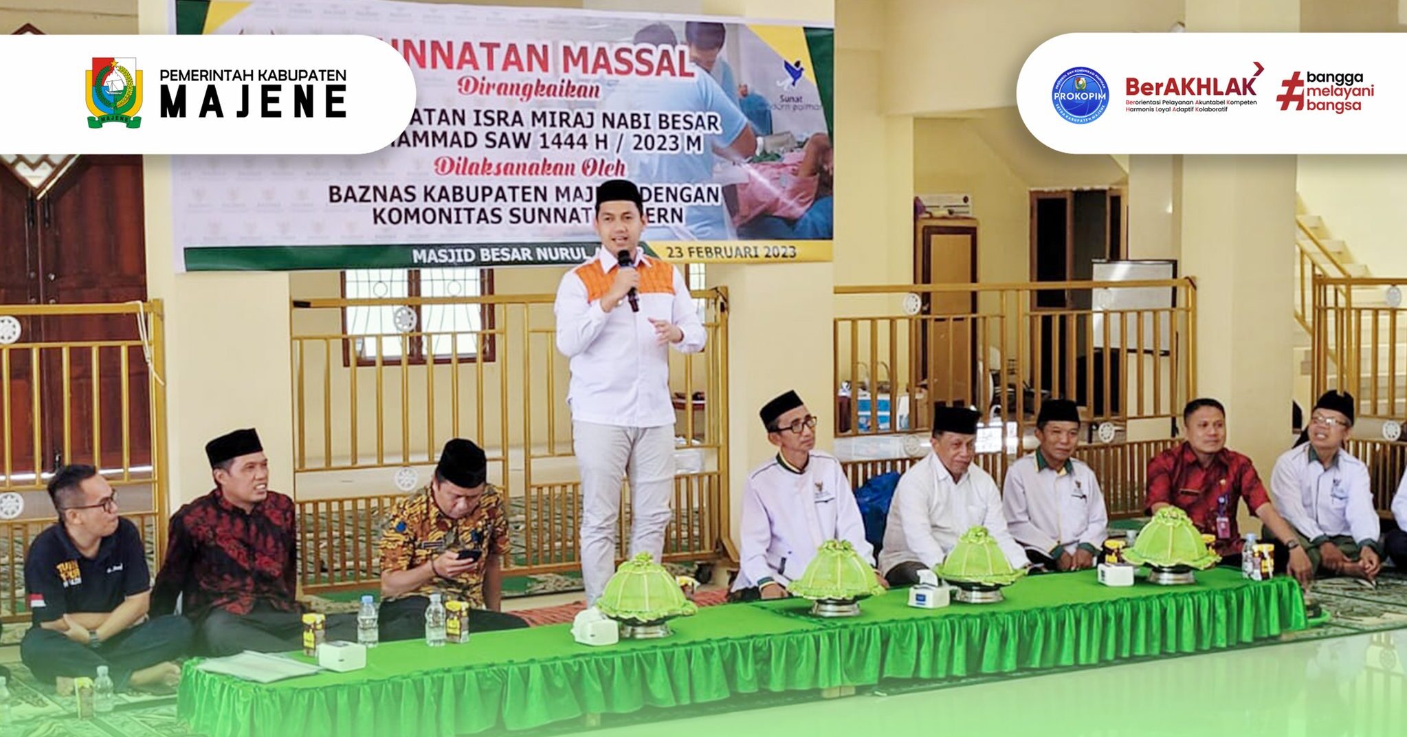 Wakil Bupati Majene, Arismunandar, S.STP.,MM menghadiri Sunnatan Massal dirangkaikan Peringatan Isra Miraj Nabi Besar Muhammad SAW yang dilaksanakan oleh Baznas Kab. Majene dengan Komunitas Sunnat Modern di Masjid Besar Nurul Abrar, Kamis 23 Februari 2023.